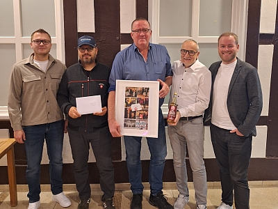Verabschiedung vom ehemaligen 1. Vorsitzenden Peter Otte (3 v. links) sowie zugleich neuer geschäftsführender Hauptvorstand v.l.n.r. Pascal Schrameyer (Kassierer), Rolf Benglan (2. Vorsitzender), Peter Otte (ausgeschieden), Jürgen Ahlers (neuer 1. Vorsitzender), Patrick Nagelmann (Geschäftsführer)