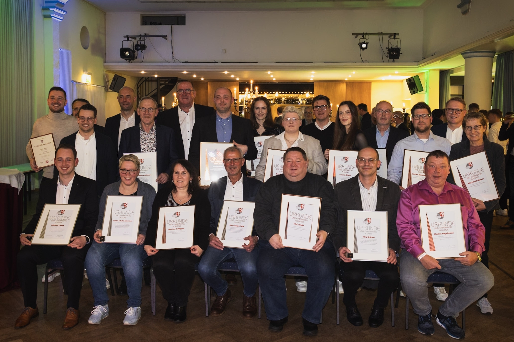 Das Abzeichen in Bronze erhielten Uwe Wermeier, Markus Nagelmann, Martina Schöpper, Leonora Shatri, Markus Kipp, Sonja Pruß, Mechthild Mersch, Bea Nagelmann, Dirk Ruwe, Leonita Shatri, Steffen Hemmersmann und Olaf Lemke. Über die Auszeichnung in Silber durften sich Hans-Jürgen Tatje, Jörg Brünen, Sandra Schulte-Albermann, Clemens Meyer zu Allendorf, Ingrid Niemann, Peter Otte und Michael Lange freuen. Tatje selbst ist seit 33 Jahren auch als Schiedsrichter aktiv.